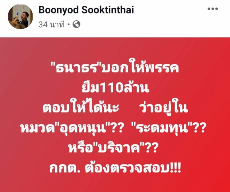 นายบุญยอด โพสต์ด้วยว่า "ธนาธร"คุยฟุ้งให้พรรคอนาคตใหม่ยืมเงิน110ล้านในขณะที่ การบริจาคเงินให้พรรคการเมืองทำได้ไม่เกิน10ล้านบาท/ปีและต้องรายงาน กกต. ทุกเดือน