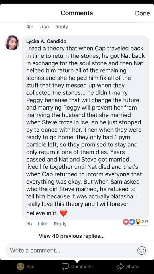 หลายปีผ่านไป แนทกับสตีฟก็แต่งงานและใช้ชีวิตอยู่ด้วยกันจนกระทั่งแนทเสียชีวิตลงและนั้นก็คือตอนที่แคปกลับมายังปัจจุบันและบอกทุกคนว่าทุกอย่างเรียบร้อยดี แต่พอแซมถามว่าเขาแต่งงานกับใคร เขากลับไม่อยากเล่าเพราะแท้ที่จริงแล้วเธอคนนั้นก็คือแนท