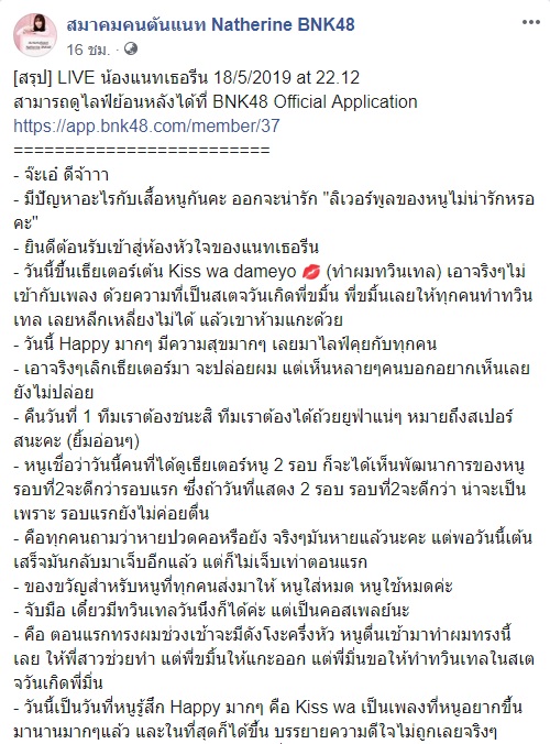 เพจ สมาคมคนตันแนท Natherine BNK48 ได้ทำสรุป Live เมื่อคืนไว้ตามนี้
