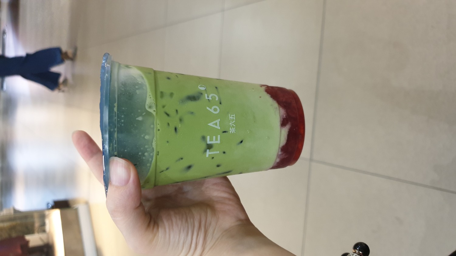 วันนี้สั่งPerfect Macha ราคา 120บาท เมนูนี้มีเนื้อสตอร์เบอร์รี่อยู่ด้านล่าง ตัวชาเขียวนมไม่หวาน ทานง่าย
