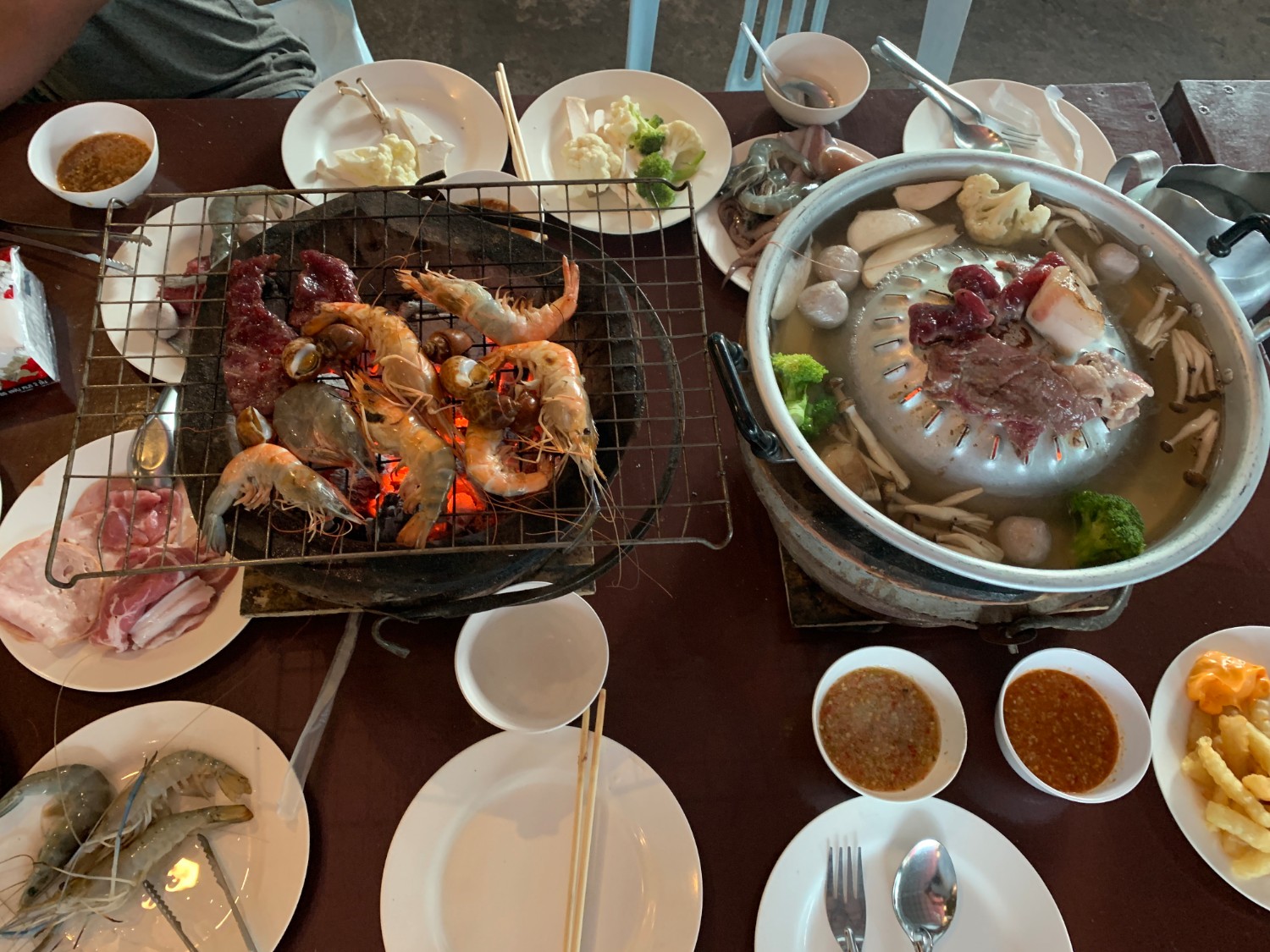 ตกกลางคืนพอกรึ่มๆได้ที่ ผมก็หาข้าวกินครับ เลยมาเจอร้านกุ้งกะทะย่านไก่แบ้แห่งเดียวบนเกาะเลยก็ว่าได้ซึ่งคนเยอะมาก มีทั้งอาหารทะเล กุ้ง หอย ปูปลาหมึก เนื้อ หมู ไก่ ครบเซ็ทเรื่องปิ้งย่างเลยครับ รสชาติรวมๆก็พอใช้ได้ ไม่ได้หวือหวา มันเป็นบุฟเฟ่เลยมีราคาหัวละ 235 ไม่รวมเครื่องดื่มโค้กหนึ่งขวดใหญ่ก็ 50 บาทและครับ ส่วนเตาย่างจะคิดเพิ่ม 89 บาทครับ