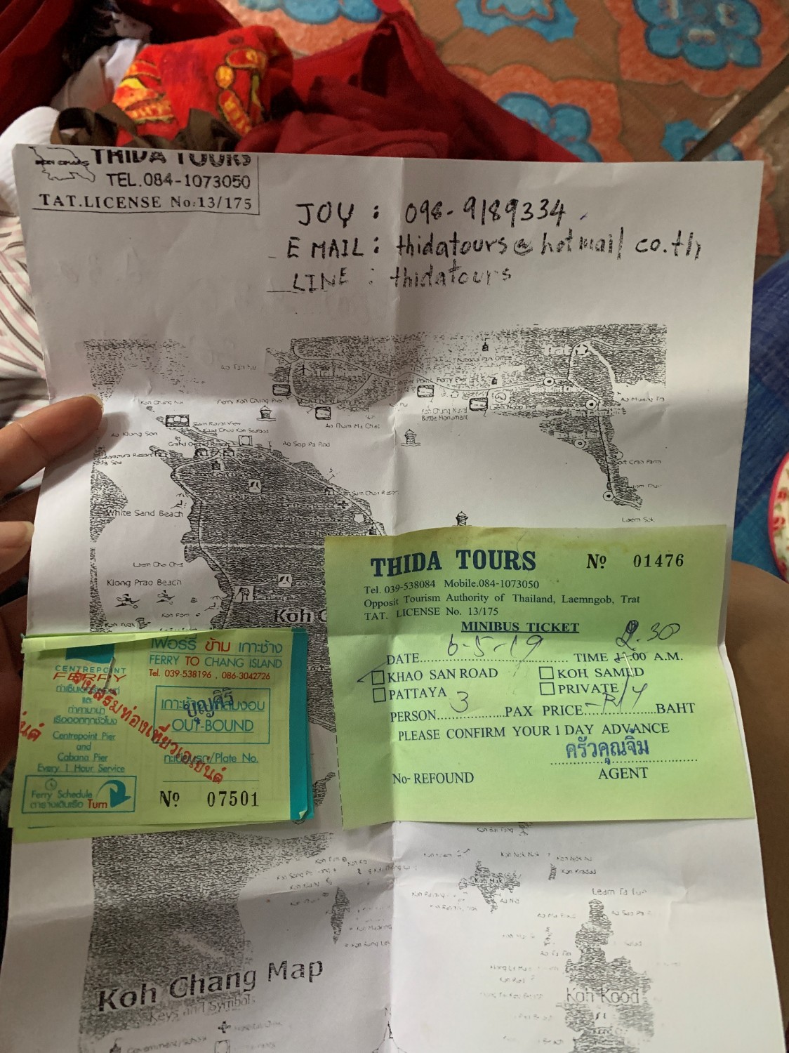 เที่ยวครั้งนี้ผมไม่ได้จองล่วงหน้า ก็เลยเน้นสะดวกง่ายๆ และไม่อยากเอารถไป เพราะยังไม่ได้มีจุดหมายที่แน่นอนเท่าไหร่ และคิดว่าจะเช่ามอเตอร์ไซค์บนเกาะขับด้วย จะได้ไม่ต้องมาพะวงค์เรื่องรถยนต์ ก็เลยเลือกนั่งรถบัส จาก ถ.ข้าวสาร ไปยังท่าเรือเซนเตอร์พ้อย ในราคา 500 บาท ราคานี้รวมค่าข้ามเรือแล้ว สะดวกกว่านั่งรถทัวร์เจ้าต่างๆกว่าเยอะครับ ทีเดียวครบเลย โดยออกจากถนนข้าวสาร เวลา 8.00 น. ถึงเวลา 14.00 น. ใช้เวลาทั้งหมด 6 ชั่วโมง จะถึงเกาะช้างเลยครับ