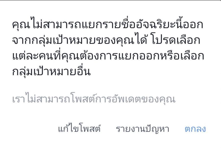 ปกติเราจะตั้งไว้ว่าเวลาโพสอะไรจะมีกลุ่มคนกลุ่มหนึ่งที่จะเราไม่ให้เห็น หรือถ้าจะให้เห็นเราก็จะมาแก้โพสตรง 'ความเป็นส่วนตัว' ในแต่ละโพสนั้นๆ แต่มาวันนี้เรากลับโพสไม่ได้ค่ะ มันขึ้นข้อความแบบนี้