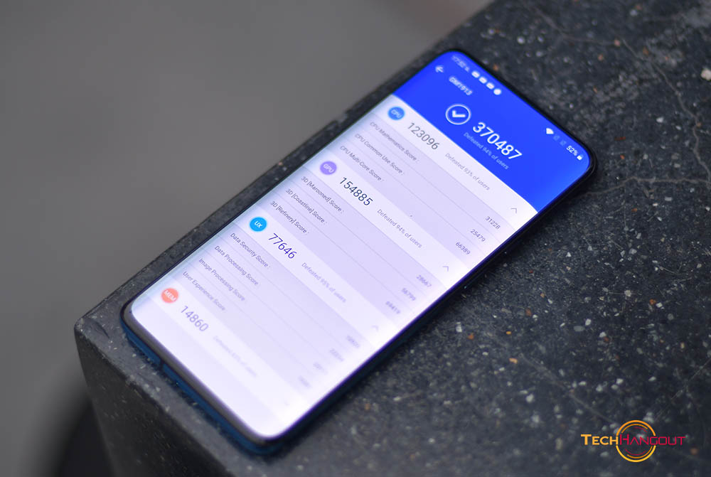 สำหรับการทดสอบคะแนน Antutu นั้นจากที่ได้ลองกดดูนั้นทำคะแนนได้ค่อนข้างสูงเลยแหละทำได้ถึง 370487 คะแนนซึ่งถือว่าอยู่ในอันดับต้นๆของ Android ในตอนนี้และยังมาพร้อมระบบระบายความร้อนด้วยของเหลว และRAM 12 GB และ การใช้ UFS 3.0 ทำให้มันจับหน้าจอ 90Hz ได้สบายๆและทำงานได้เต็มที่ของตัวเครื่องถือว่าเป็นอีกรุ่นที่มีความแรงในการใช้งานทั้งเรื่องของการเล่นเกม และ ในการใช้งานทั่วไปได้สบายๆครับ