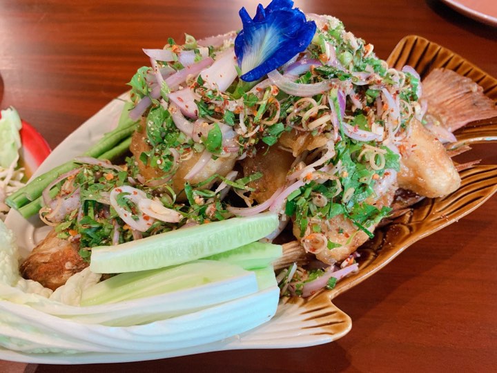 3.ปลาทับทิมทอดลาบน้ำตก ปลาสดหั่นชิ้นทอดกรอบนอกนุ่มใน แนะนำให้ลองค่ะ