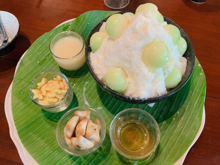 สุดท้ายแล้วตามด้วยของหวาน บิงซูนมสดเมล่อน มาพร้อมกับนมข้น+น้ำผึ้ง +และของขบเคี้ยว2อย่างค่ะ