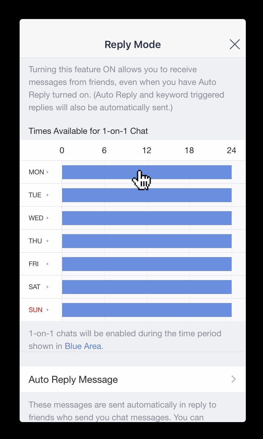เลือกคลิ๊กเข้าไปตั้งค่าทุกวัน ตั้งแต่จันทร์ ถึงอาทิตย์ ถ้ายังไม่ได้เข้าไปตั้งเวลาการรับข้อความจะเป็นแทบเปล่าไม่มีสีฟ้า นั่นหมายความว่าเวลานอกจากนั้นจะไม่ได้รับข้อความใดๆเลย พุดดิ้งจึงเปิดให้เป็นแทบสีฟ้าทั้งหมด ไม่สำคัญว่าลูกค้าจะส่งข้อความมานอกเหนือจากการทำงานถึงแม่ว่าเราจะไม่ตอบกลับแล้ว แต่ถ้าเปิดฟังก์ชันในโหมดตอบกลับเวลาไม่อยู่ ถ้าเราตั้งคีย์เวิร์ดไว้ที่ลูกค้าถาม ข้อความจะตอบกลับอัตโนมัติแทน (อันนี้ไว้จะมาแชร์อีกอัน)