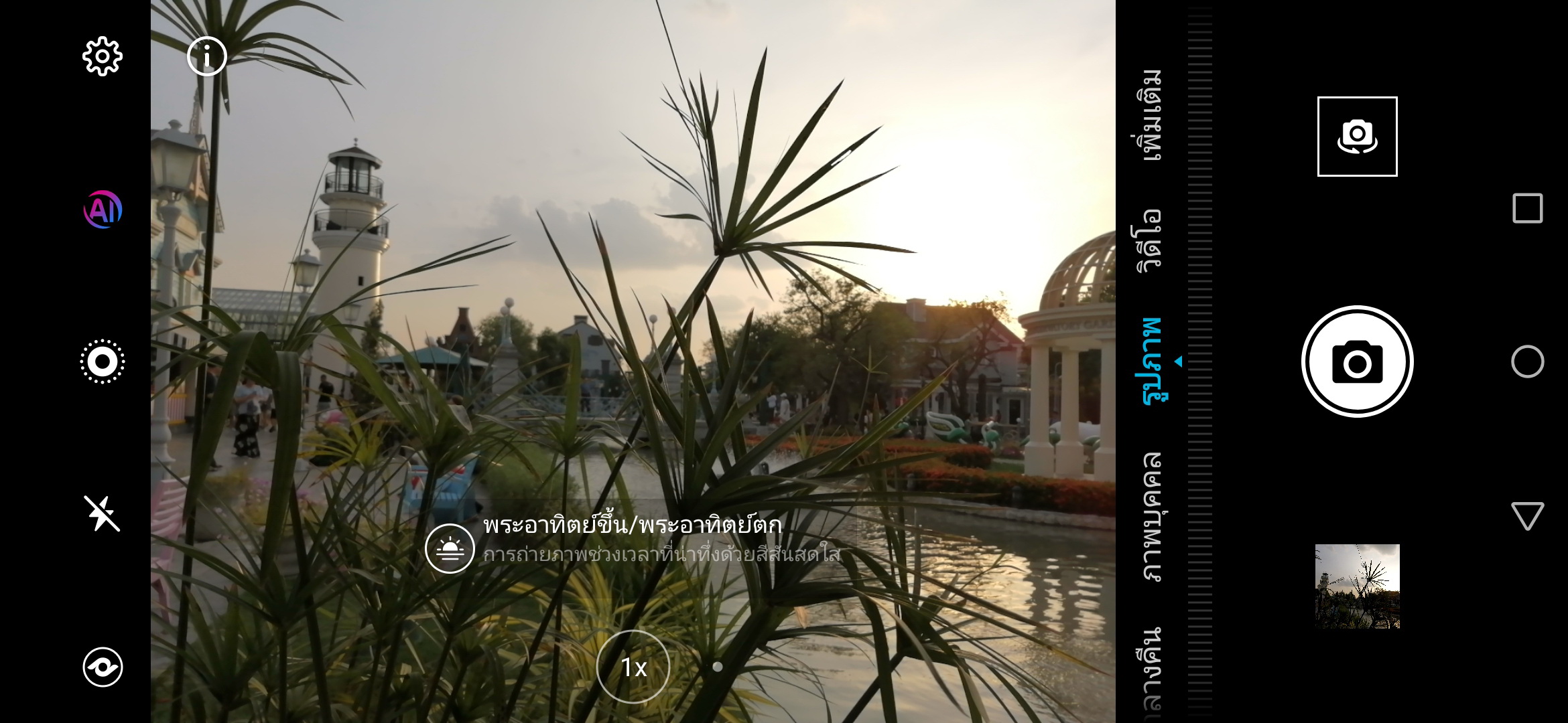 เมื่อเปิด AI ตัวโปรแกรมจะเข้ามาจำแนกฉากต่างๆให้เพื่อการถ่ายภาพที่มีประสิทธิภาพมากขึ้นและที่สำคัญถ่ายง่ายขึ้นด้วยครับ ใครๆก็สามารถถ่ายได้สวยเช่นกัน อย่างเช่นภาพนี้ถ่ายย้อนแสงยังทำได้ดีทีเดียว