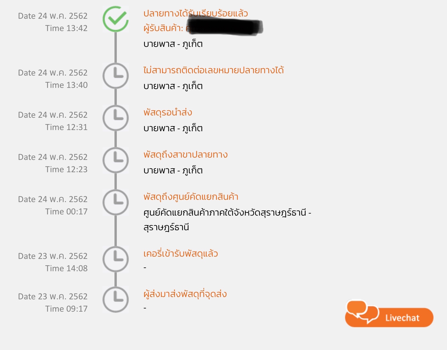 รู้สึกหงุดหงิดเลยคับ สั่งชาเขียวราคาแพงไว้ กะว่าต้องได้วันเสาร์ (25 พ.ค. 62) เพราะวางแผนจะชงให้ที่รักทาน เพราะอีกหน่อยเขาต้องไปเรียนต่อ กลัวจะหาโอกาสทำให้ทานยาก โชคดีเขามีธุระไม่ได้มาเจออาทิตย์นี้ สามวันมานี้ผมติดงาน กทม. วันนี้มาถึงหอพัก เช็คสถานะออนไลน์ สรุป ของผมถูกรับเรียบร้อยแล้วตั้งแต่เมื่อวาน โดยผู้รับคือชื่อผมเอง งงเลยครับ พอถามผู้ดูแลหอพัก เขาบอกว่ายังไม่ได้รับของใด ๆ เลย (ปกติถ้าเขารับส่วนใหญ่เขาใช้ชื่อตัวเอง)