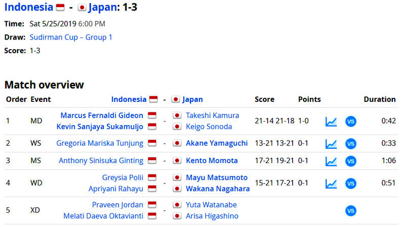 • ผลการแข่งขัน รอบรองชนะเลิศ [25 พ.ค. 62] : Indonesia vs Japan