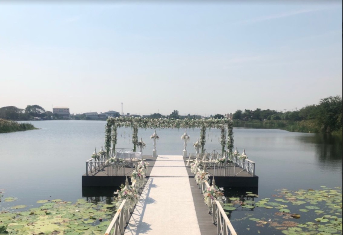 พาเดินแนะนำสถานที่ ซึ่งโซนที่เป็นแพกลางน้ำที่ใช้ทำพิธีรดน้ำสังข์