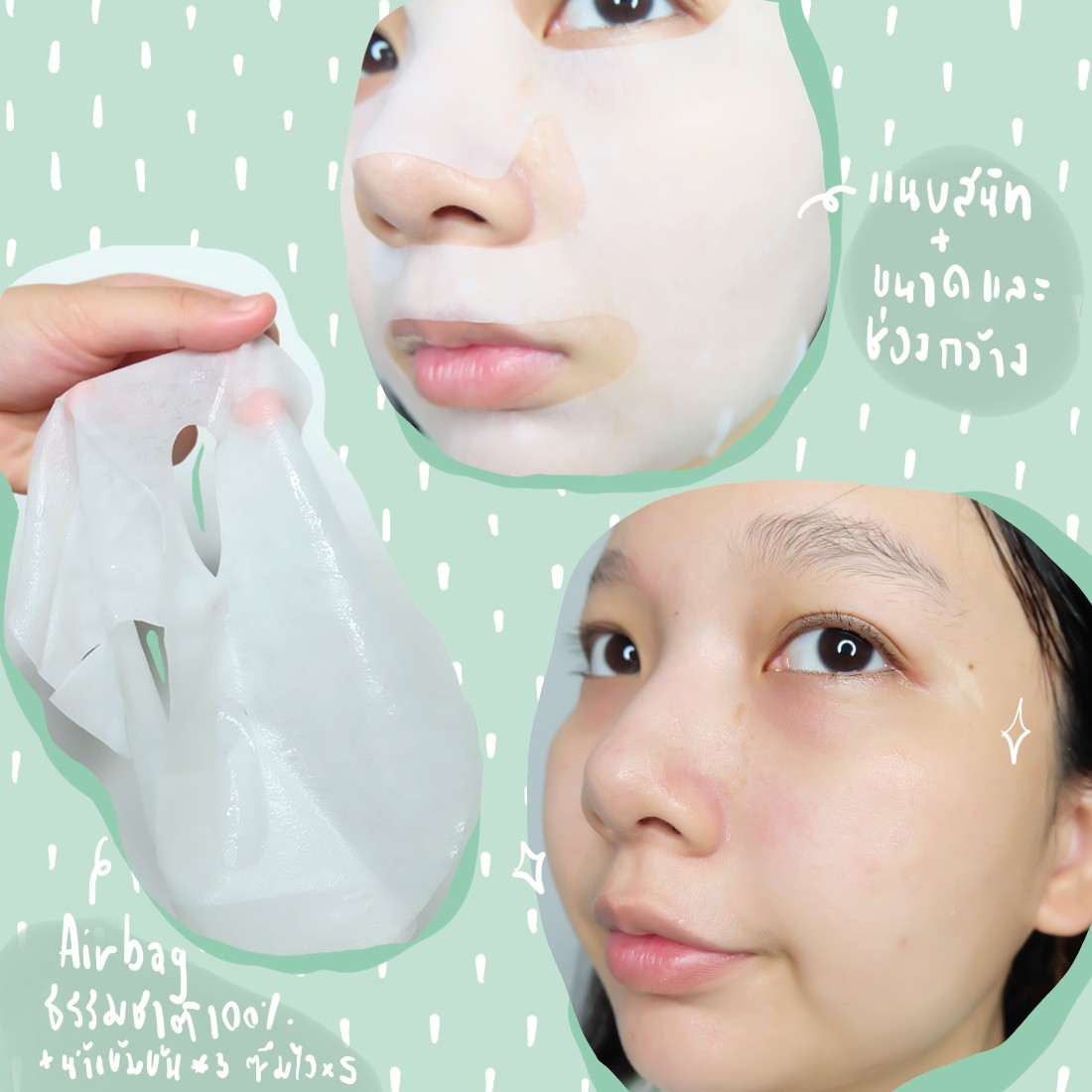 แบบ AirBag ทำจากเส้นใยฝ้ายธรรมชาติ 100% อ่อนโยน กักเก็บเอสเซ้นส์ได้ดี และวางบนผิว แล้วแนบสนิทลงกับผิวหน้า ตัวแผ่นมีความกว้าง