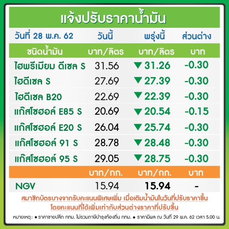 แจ้งปรับราคาน้ำมันขายปลีก มีผลพรุ่งนี้ ตี 5 (วันที่ 29 พ.ค. 62 เวลา 5.00 น.)
