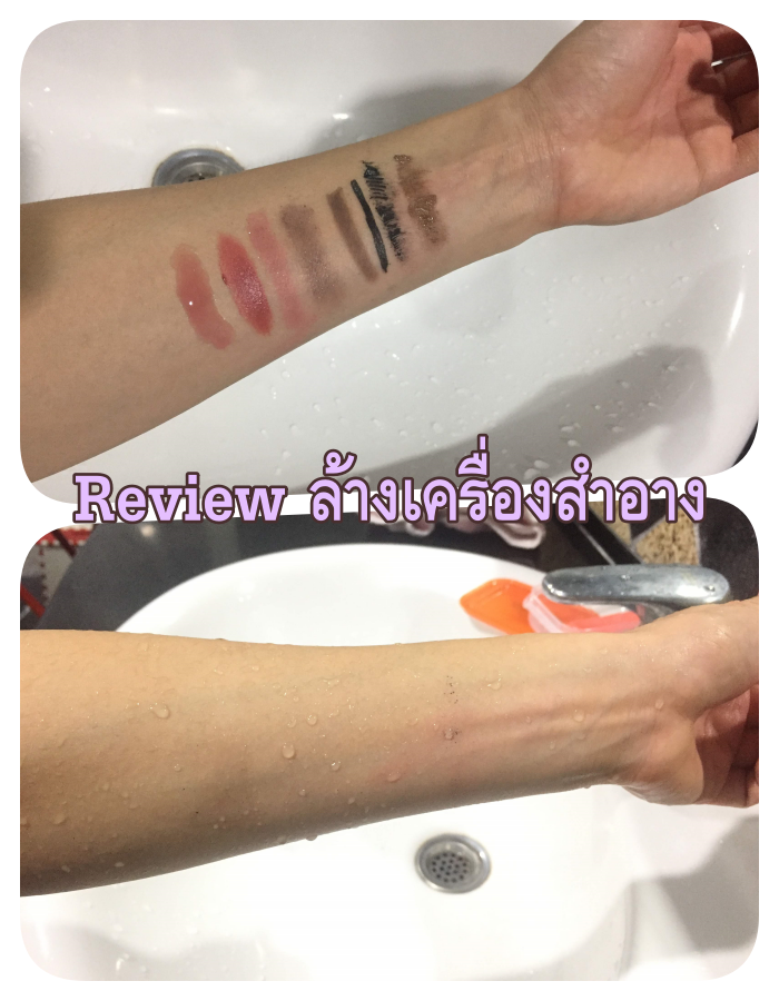 เราทาเครื่องสำอางบนแขนด้านซ้าย ซึ่งเป็นเครื่องสำอางที่ใช้ประจำเวลาแต่งหน้า คือ ลิป ลิปกลอส บรัชออน อายชาโดว อายไลเนอร์ มาสคาร่า ที่เขียนคิ้ว มาสคาร่าคิ้ว แล้วลองนำไปล้างกับสบู่โพรเทคส์ ไทยเทอราพี มะเขือเทศ ปรากฎว่าผลเป็นที่น่าพอใจมาก ถูไม่กี่ทีเครื่องสำอางก็ออกจนหมด จะเหลือไว้ก็แต่รอยมาสคาร่านิดๆ ถือว่าสามารถล้างเครื่องสำอางได้ 95% เลยทีเดียว