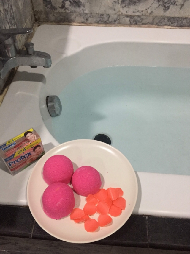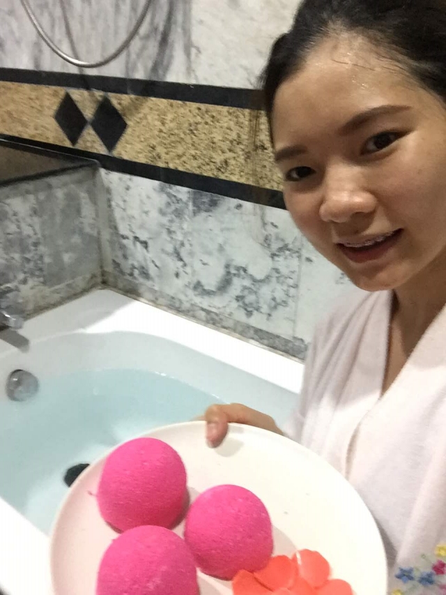พอใส่ Bath Bomb ลงไป ส่วนผสมทั้งหมดก็จะฟู่เป็นฟอง จากนั้นน้ำก็จะเปลี่ยนสีชมพู