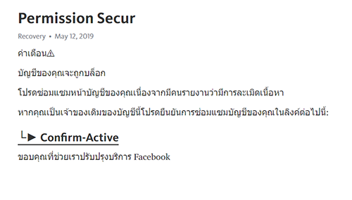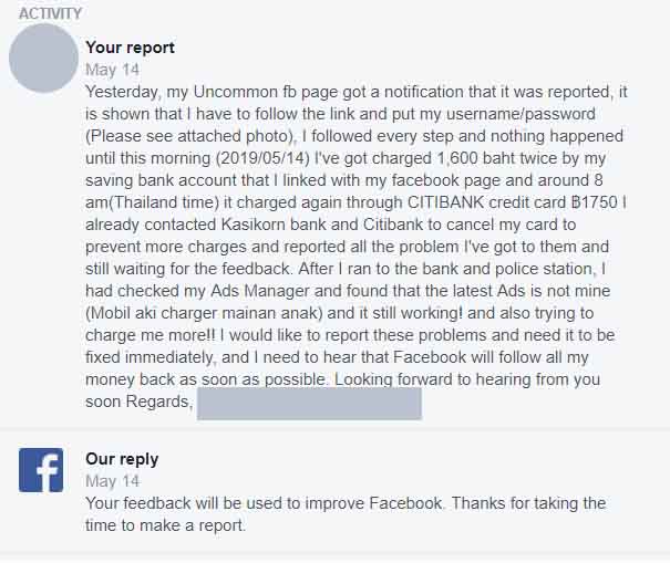 ช่วงปลายเดือนมีนาคมได้สร้างเพจใหม่ขึ้นมาขายเครื่องประดับ เราก็ได้มีการซื้อโฆษณาเข้าถึงลูกค้าเช่นเดิมด้วยบัตรเครดิตอันเดิมยอดไม่เคยเกิน1500บาทต่อเดือน ทุกอย่างก็ปกติดีจนกระทั่งวันจันทร์ที่13 (13/05/20019) ตอนเช้าเราเช็คเพจแล้วเจอข้อความเหมือนเพจโดนรายงานจาก FB ว่าเราไปละเมิดหรือทำผิดกฎอะไรสักอย่าง ตอนแรกก็แอบเอะใจอยู่นะ ว่าทำไมมันใช้ฟ้อนต์แปลกๆ แต่ด้วยความที่รีบและเคยโดนแจ้งเตือนอีกเพจหนึ่งมาก่อน(เพจปล่อยเช่าคอนโด FBสงสัยว่ามีการให้สัญญาเกี่ยวกับเรื่องสินเชื่อ ซึ่งเราได้ชี้แจงไปว่าไม่มี!! ก็จบไป) ทำให้เราไม่คลิกเข้าไปดูและอ่านรายละเอียดของตัวที่แจ้งให้รอบคอบ กดทำตามขั้นตอนที่มันขึ้นมา ซึ่งมีให้ใส่รหัสและUser (ควายแท้ๆทำไมคิดไม่ได้ ประเด็นคือไม่ได้ไปละเมิดอะไรไง!) ทำเสร็จก็ไม่มีอะไรเกิดขึ้น