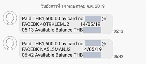 จนเช้าวันที่ 14 ตื่นมาก็งานเข้าเลยจ้า มีแมสเซจเตือนจากแบงค์สีเขียวว่ามีตัดบัตรเราค่าFB 1600บาท สองรอบ เวลา 05:13 กับ 06:42 ซึ่งผมยังไม่ตื่นเลยครับพี่ งงเป็นไก่ตาแตก และมั่นใจมากว่าเดือนนี้โฆษณาไปไม่ถึง500บาทด้วยซ้ำ ของเดือนที่แล้วก็จ่ายไปแล้ว ตัดบัตรเดียวกันเนี่ยแหละ งงในงงว่ามายังไง เลยโทรไปที่คอลเซ็นเตอร์เพื่อที่จะอายัดบัตร สอบถามไป พนง.บอกว่าเป็นค่าใช้จ่ายจากเฟซบุค คุณลูกค้าได้ใช้หรือเปล่า เราก็บอกว่ามีใช้ แต่ไม่ใช่ยอดนี้ พนง.ก็ตอบกลับมาว่าเฟซบุคอาจจะเก็บย้อนหลังก็ได้ เราก็เฮ้ย เดือนที่แล้วตัดไปแล้ว งวดก่อนๆก็โดนไปแล้วจะมาตัดย้อนไปย้อนมาหรอ เป็นไปได้ไง พนง.เลยถามว่าจะให้ดำเนินการยังไง จะกลับไปนึกดูก่อนไหมว่าได้ใช้หรือเปล่าหรือจะอายัดเลย เรากลัวมันจะตัดไปยิ่งกว่านี้เลยสั่งอายัดไปก่อนดีกว่า แล้วก็สอบถามพนง.ว่าต้องทำยังไงต่อ เราจะปฏิเสธยอดการใช้จ่ายได้ไหม เพราะเราไม่ได้ใช้ ไม่มีให้กรอกรหัสOTPใดๆด้วย (ซึ่งตอนตัดบัตรซื้อโฆษณาปกติก็ไม่มีให้กรอก) พนง.ก็แนะนำให้ไปธนาคารที่ใกล้ที่สุดเพื่อกรอกเอกสารทักท้วง และทำบัตรเดบิตใหม่