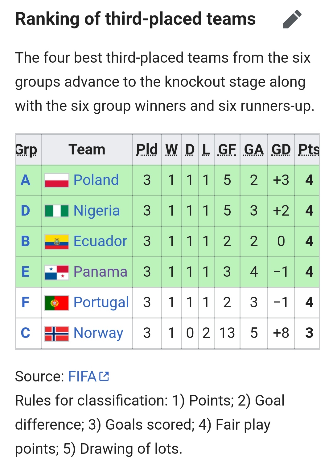 จะเห็นได้ว่าจากการที่นอรเวย์พยายามเอาชนะฮอนดูรัส12-0เพื่อให้ได้ผลต่างประตูได้เสียบวกมากที่สุด แต่ก็ยังไม่พออยู่ดี หรือแม้กระทั่งโปรตุเกสที่มี4คะแนนแต่ก็ยังตกรอบ