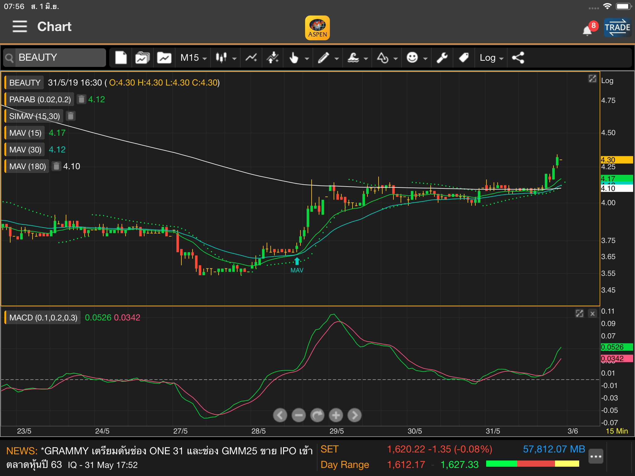 กราฟแสดงการทะลุเส้น 180 ขึ้นไปได้อย่างสง่างามหลังทดสอบอยู่พักใหญ่ ยังไม่มีสัญญาณขายให้ let profit run ขอบคุณกราฟ Aspen
