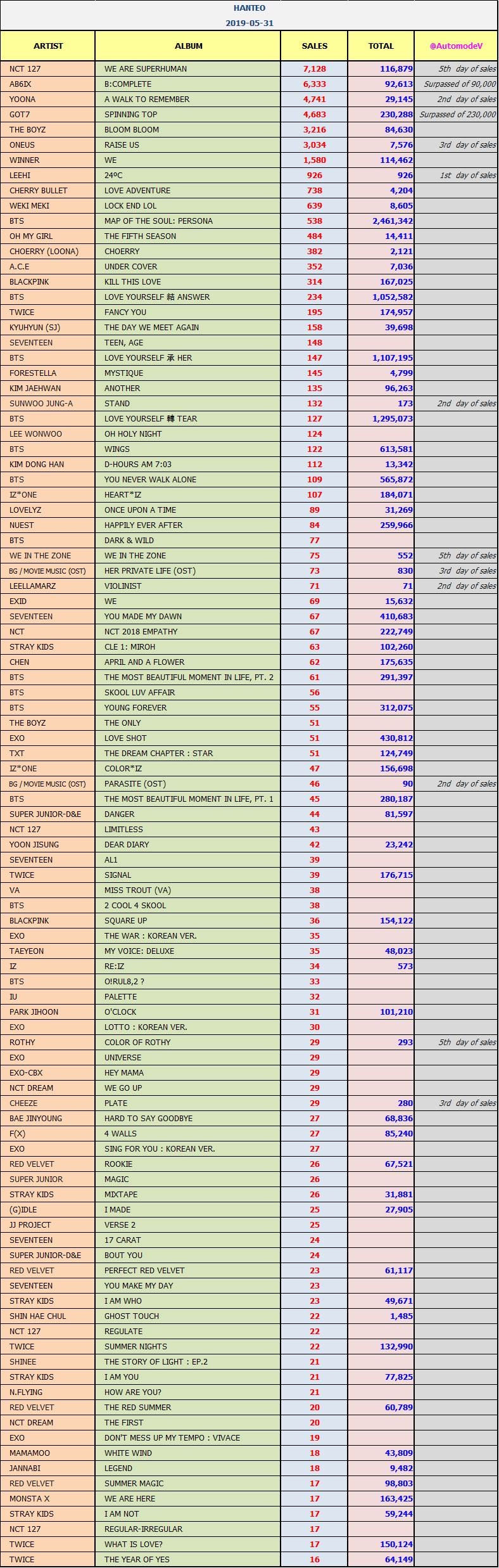 ยอดซื้ออัลบั้มจากชาร์ต HANTEO 31 พฤษภาคม 2562 + 1st FEMALE SOLOISTS (์แก้ไข)