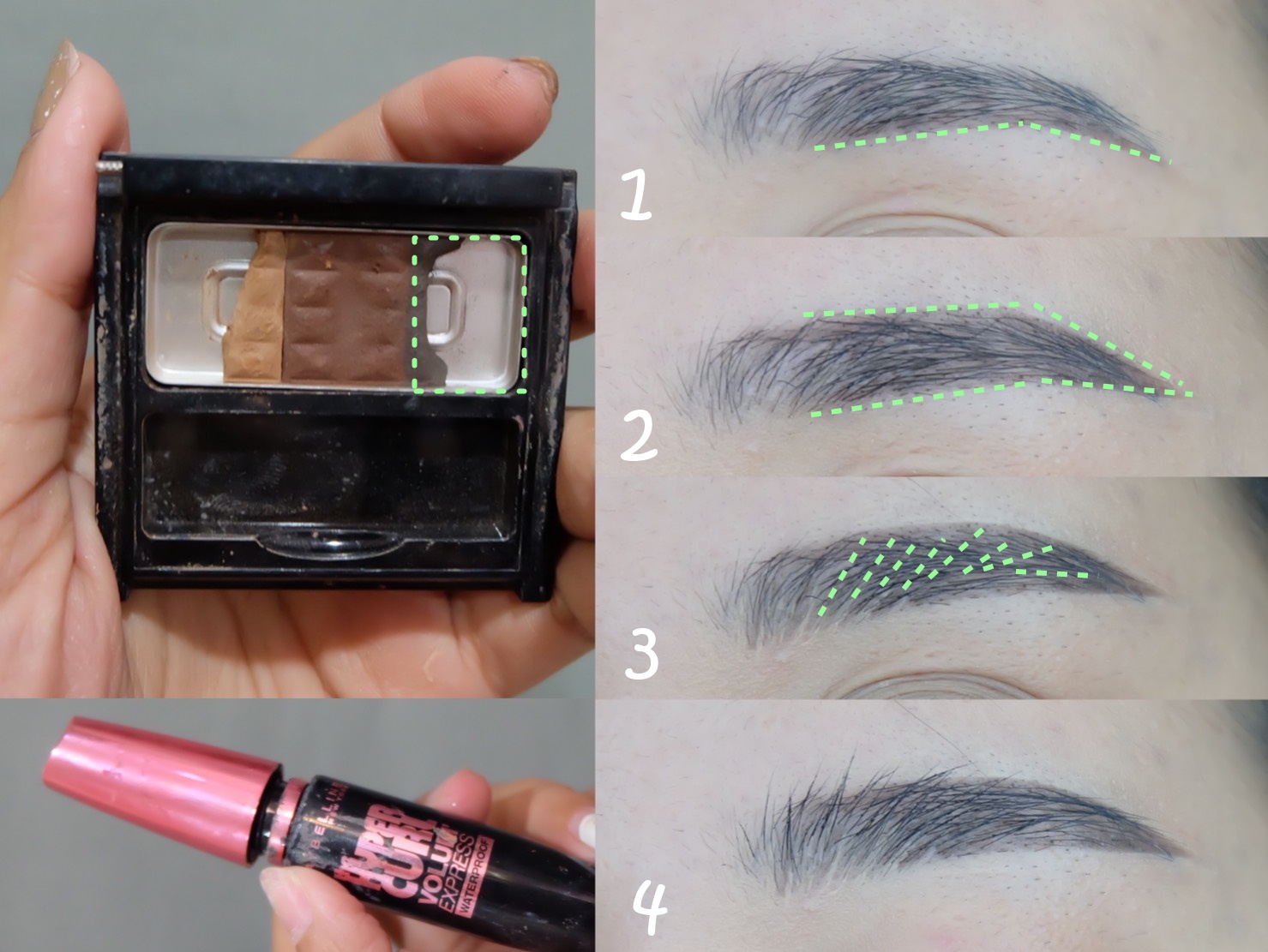 และใช้คอนซีลเลอร์เก็บรายละเอียดแล้วก็จะใช้สีเดิม เขียนหัวคิ้ว เป็นเหมือนเส้นขนคิ้วปลอม แล้วก็ปัดสมาสคาร่าคิ้วได้เลยค่า