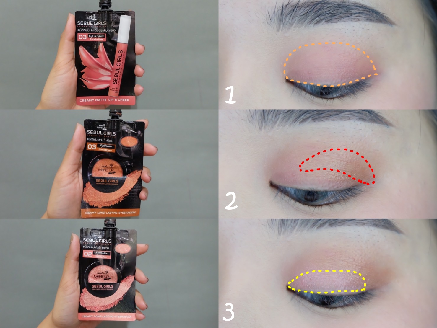 แล้วใช้นิ้วมือเกี่ยให้เนียน จากนั้นจะใช้ NAMI MAKE UP PRO SEOUL GIRLSCREAMY LONG-LASTING EYESHADOW