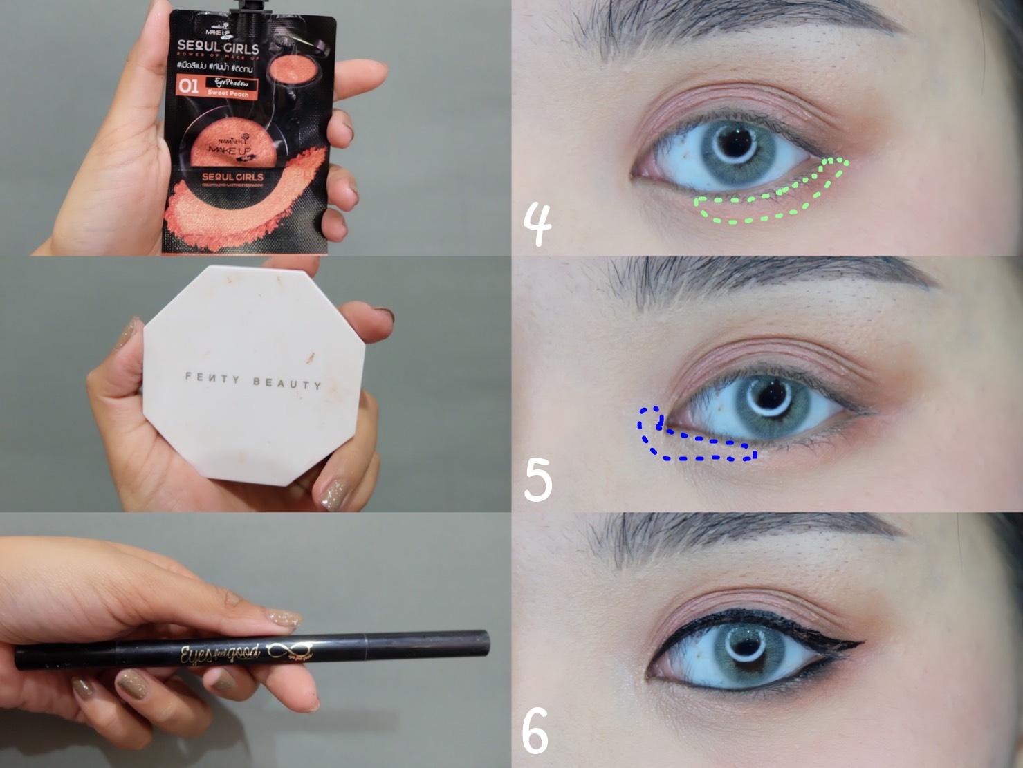 sweety peach ทาปลายตาล่าง แล้วเกลี่ยให้เนียนทาไฮไลท์หัวตาเล็กน้อย เพื่อให้ดวงตาดูไบรท์ เขียนอินไลน์เนอร์สีดำ