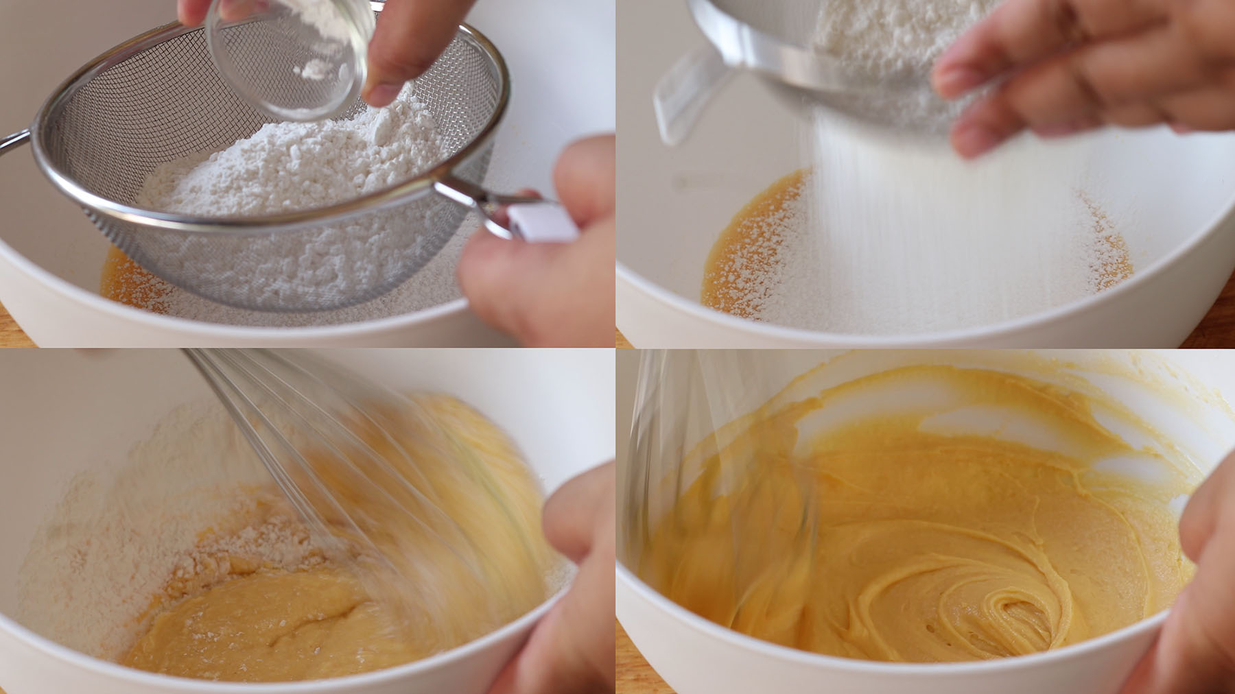 2.ร่อนแป้ง+ผงฟู ลงไปในชามผสม ตะล่อมจนเข้ากัน