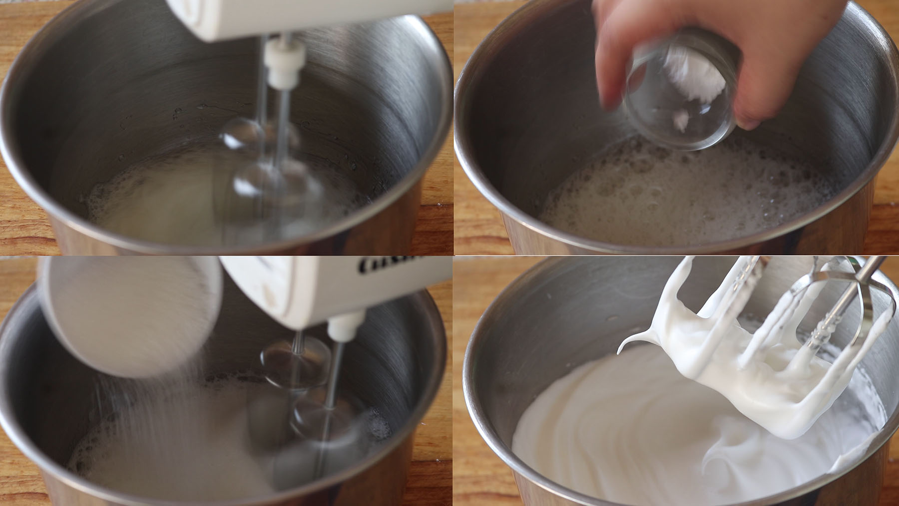 3.ตีไข่ขาวจนเป็นฟองหยาบแล้วใส่ครีมออฟทาร์ทาร์ตีพอเข้ากัน จากนั้นทยอยใส่น้ำตาลทรายลงไป แบ่งใส่สัก 3 ครั้ง ตีจนตั้งยอด