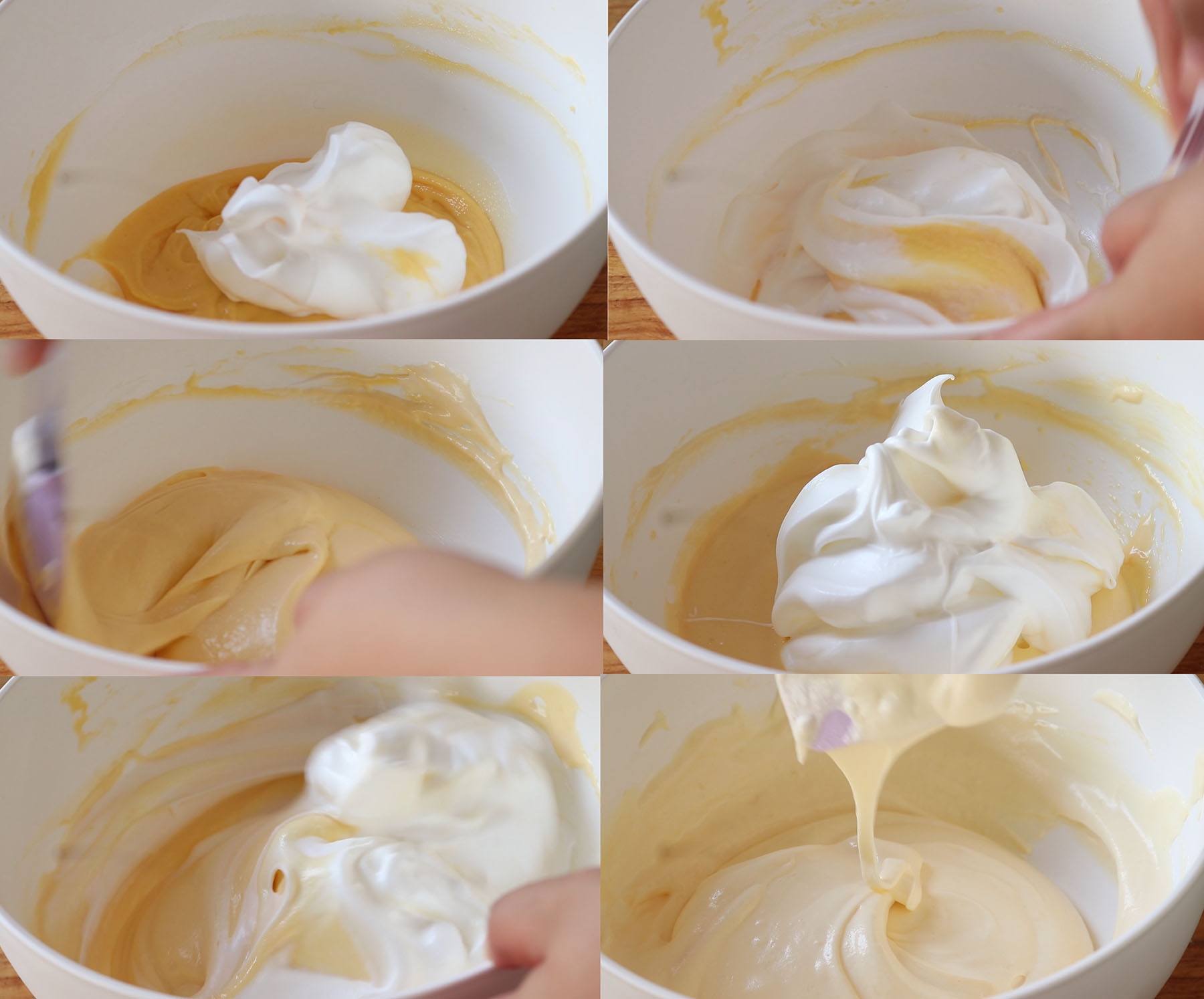 4.ตักไข่ขาวมาบางส่วนใส่ชามไข่แดงที่ผสมไว้ ตะล่อมเบาจนเข้ากัน พอเข้ากันแล้วก็ใส่ที่เหลือลงไปตะล่อมจนเนียนเข้ากัน