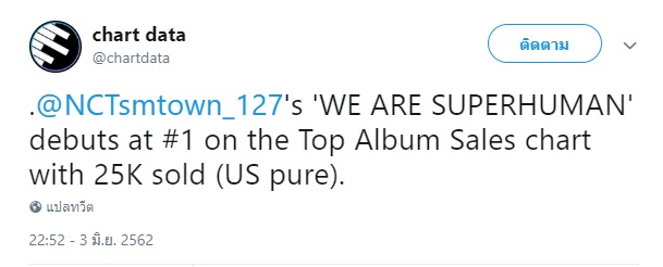 จากการอัพเดทโดย @chartdata เมื่อสักครู่ที่ผ่านมา มินิอัลบั้ม We Are Superhuman โดย NCT 127