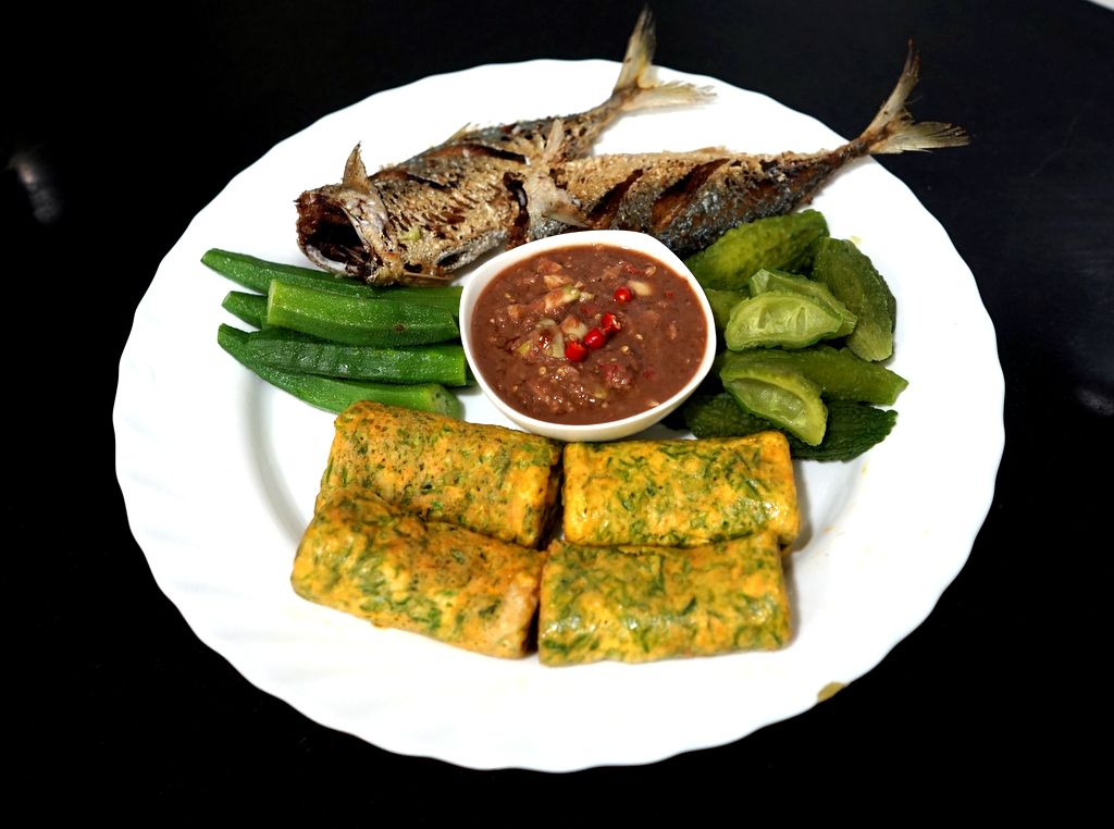 น้ำพริกกะปิ ไข่ชะอมม้วน ปลาทูทอด ผักลวก