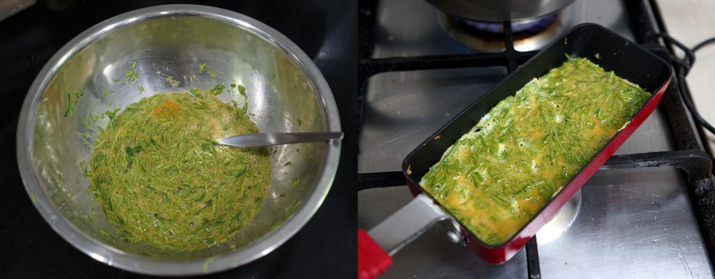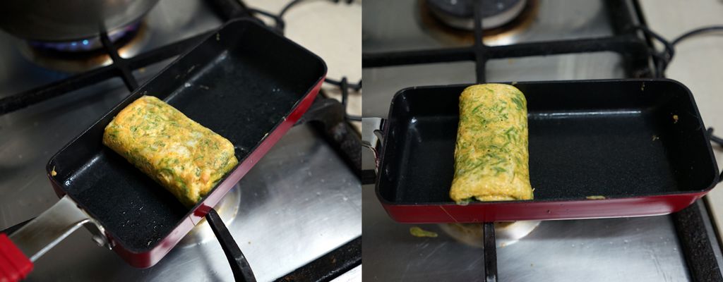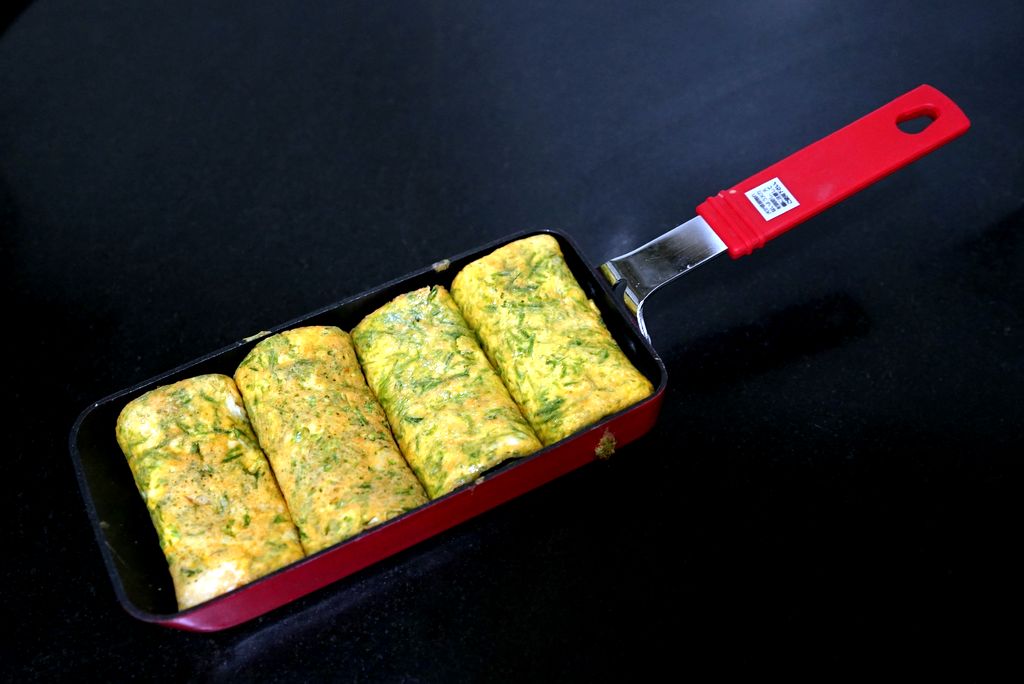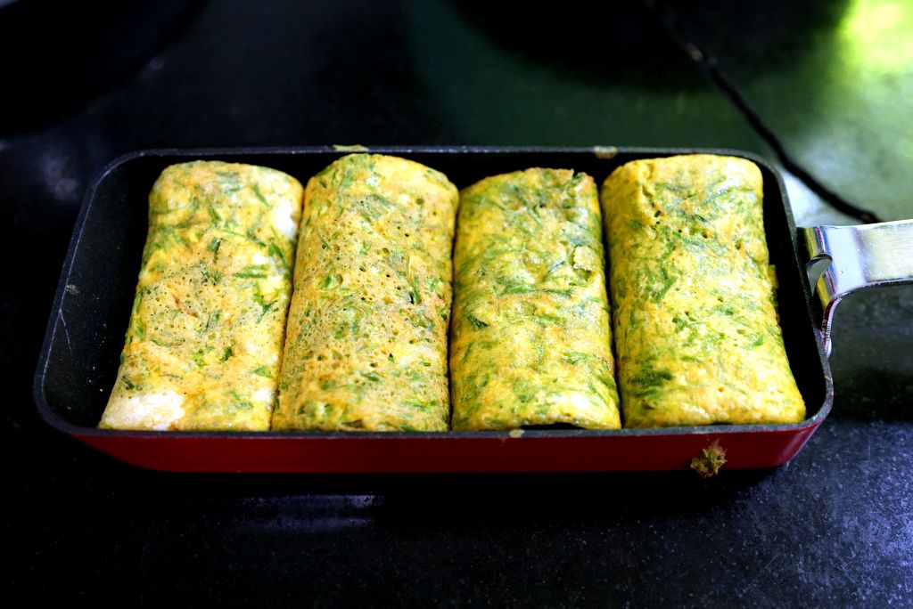 ไข่ชะอบนำมาทอดด้วยกระทะไข่ม้วนญี่ปุ่นใบเล็ก