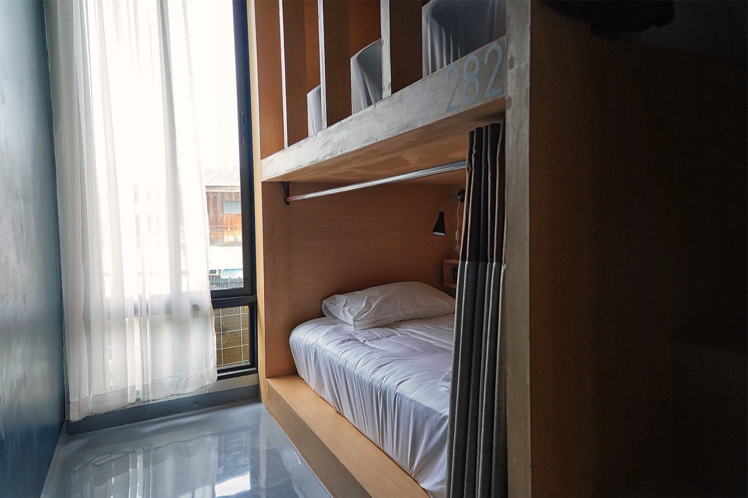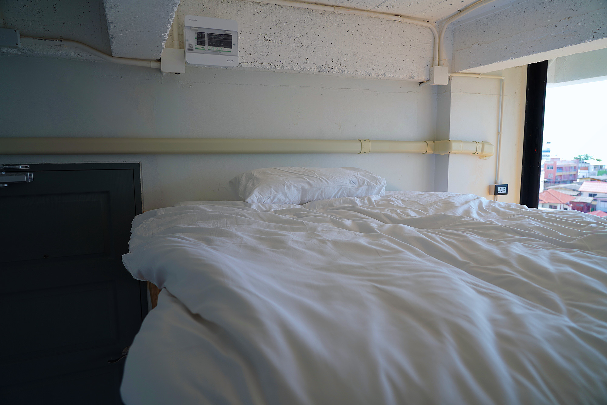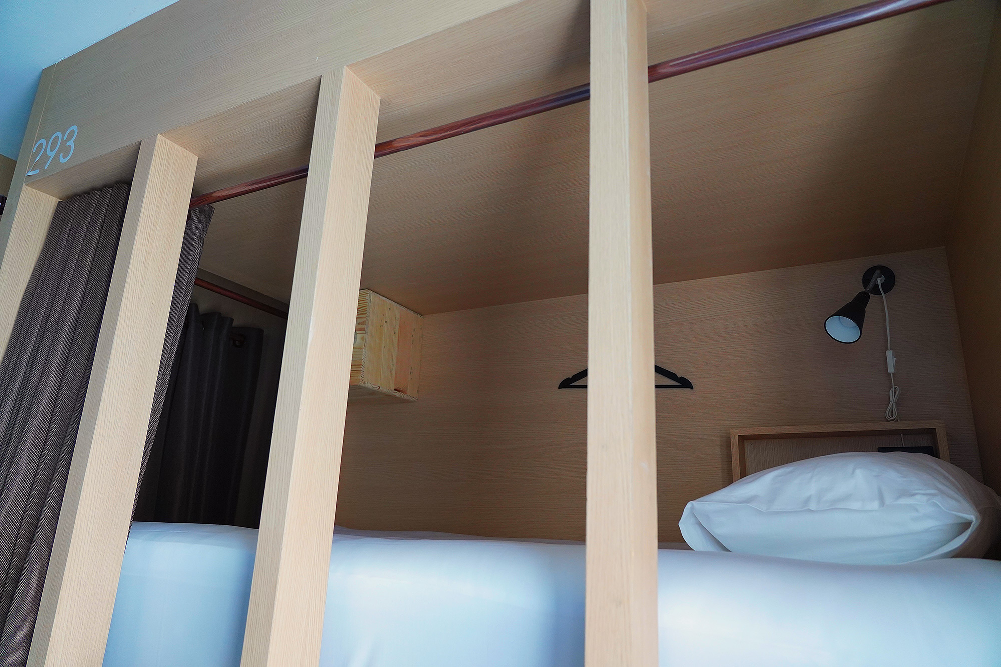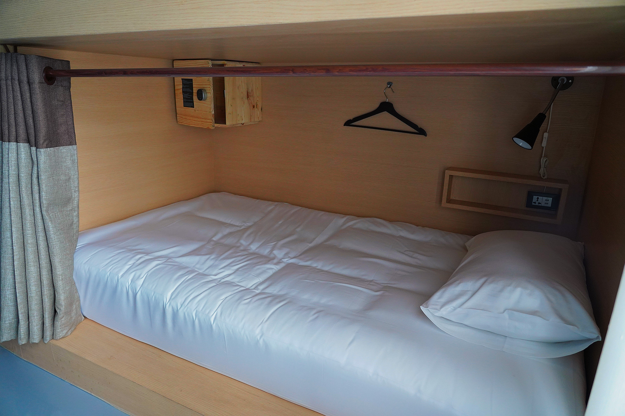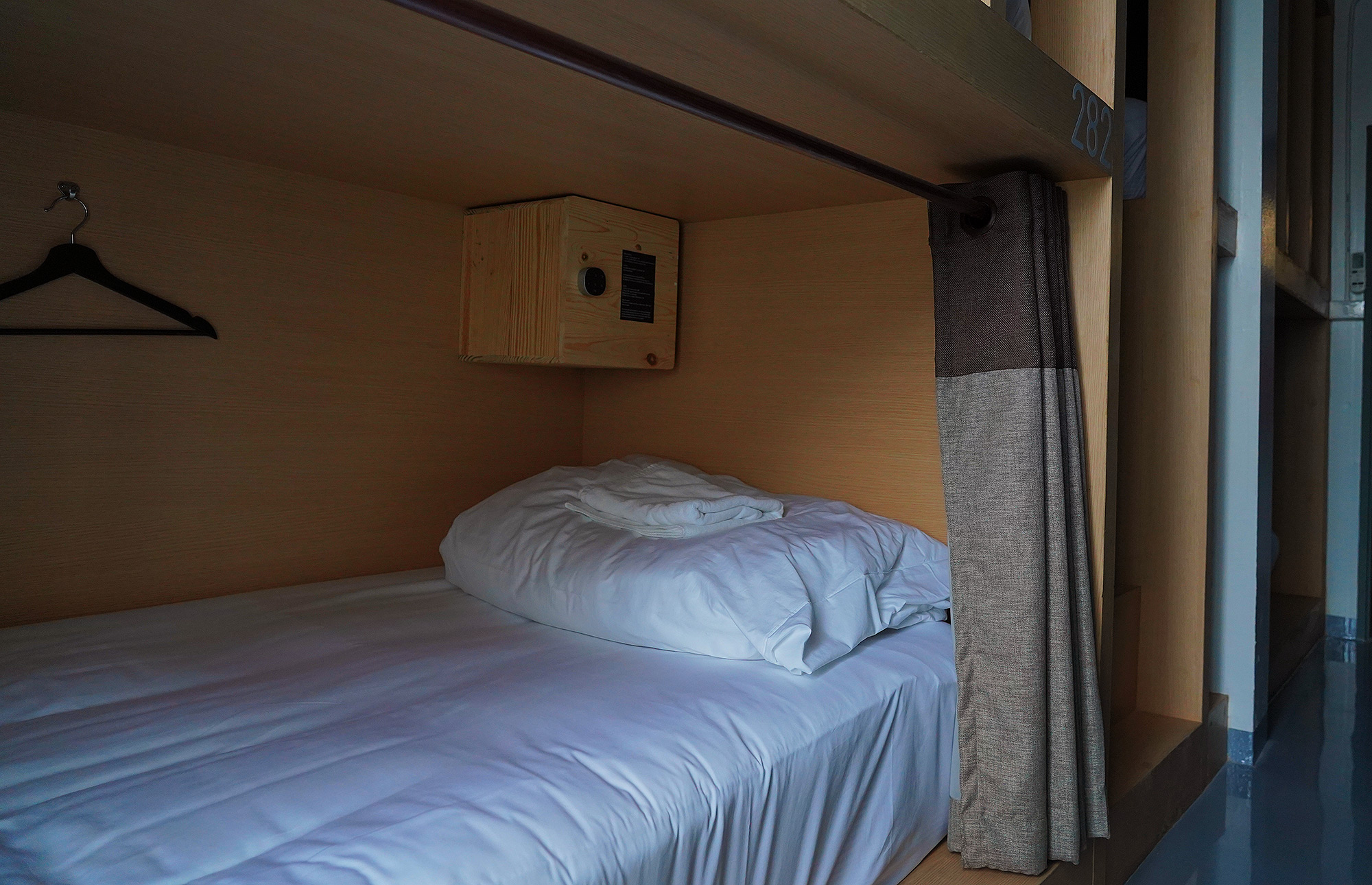 เห็นแล้วอยากลองนอนเลย เหมือนพวกโรงแรมแคปซูลในญี่ปุ่น แต่ space กว้างขวาง มีสิ่งอำนวยความสะดวกครบมาก ทั้งตู้นิระภัยเก็บของมีค่า ไฟหัวเตียง แล้วก็ปลั๊กแบบ usb เรียกว่าถึงก็เสียบชาร์ตมือถือได้เลย
