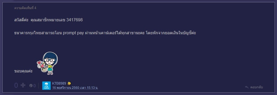 เมื่อวานนี้ 4/6/62 ผมได้ให้คุณแม่ไปโอนเงินที่เคาเตอร์ ของ KTB ให้ โดยให้โอนเงินไปเข้าผ่าน ระบบ Prompt pay