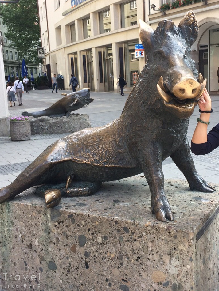 ใกล้ๆกับ Marienplatz มีรูปปั้นหมูป่าตัวหนึ่งนั่งอยู่ “Sitting wild boar” มีธรรมเนียมของคนที่ผ่านไปผ่านมาแถวนี้ว่า ถ้ามาจับเขี้ยวของเจ้าหมูป่าตัวนี้แล้วจะโชคดี เราก็เลยจับซะหน่อยค่ะ บริเวณนี้มันก็เลยจะลื่นๆหน่อยเพราะมีคนจับเยอะ 555 หมูป่าตัวนี้นั่งอยู่ที่นี่มาตั้งแต่ปี ค.ศ. 1976 และด้านหลังของเจ้าหมูป่าตัวนี้ จะมีปลาดุกอีกตัว ซึ่งก็มีคำเล่าขานกันมาว่าถ้าไปจับแล้วจะมีสุขภาพดี