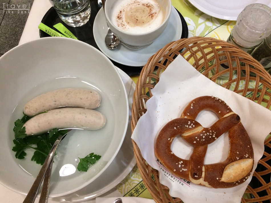 เช้าวันรุ่งขึ้น เราไปทานมื้อเช้าที่สถานีรถไฟ Munich Hbf ... อาหารเช้าแบบชาวมิวนิคของแท้ต้องเป็นแบบนี้ค่ะ ... ไส้กรอกอร่อยสุดๆ pretzel ก็อร่อยไม่แพ้กัน ไม่แข็งโป๊กเป๊กเหมือนที่ขายในเมืองไทย