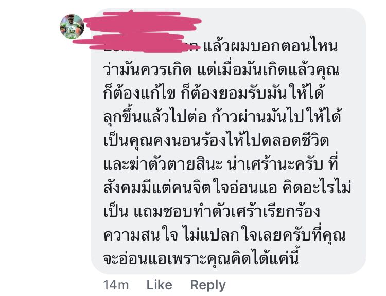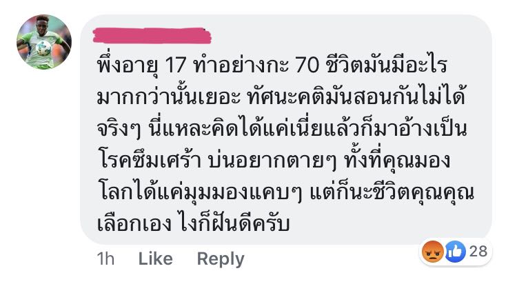 คุณลองคิดดูนะคะว่าคุณเป็นผู้ป่วยโรคซึมเศร้าแล้วต้องมาเจอเม้นจากคนโลกแคบแบบนี้ ไม่พอค่ะ ยังพยายามเหลือเกินที่จะไม่ยอมรับว่ามันคือความผิดปกติทางสมองและได้รับการยอมรับแล้วว่าโรคซึมเศร้าก็นับเป็นการพิการอย่างหนึ่ง จริงๆแล้วจขกทข้ามไปก็ได้แต่มันสุดจะทนแล้วจริงๆ นี่ไม่ใช่ครั้งแรกแต่หลายต่อหลายครั้งที่เวลาอ่านข่าวใครก็แล้วแต่เสียชีวิตหรือยุติชีวิตจะมีคอมเม้นแย่ๆแบบนี้โผล่ขึ้นมา มันทำให้ตัวเราคิดหนักมากว่าทำไมคนเหล่านี้ถึง ignorant ได้เพียงนี้ โทรศัพท์ก็มีน่าจะหาข้อมูลบ้างเพราะการพูดจาในทำนองแบบนี้ถือเป็น cyber bully อย่างหนึ่ง