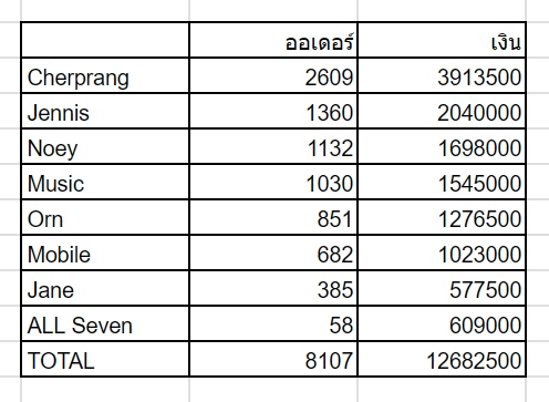 หมายเหตุ ยอดจริง อาจจะต่างจากนี้เล็กน้อย เนื่องจาก อาจจะมีผู้สั่ง แล้ว ไม่จ่ายเงินทันเวลา