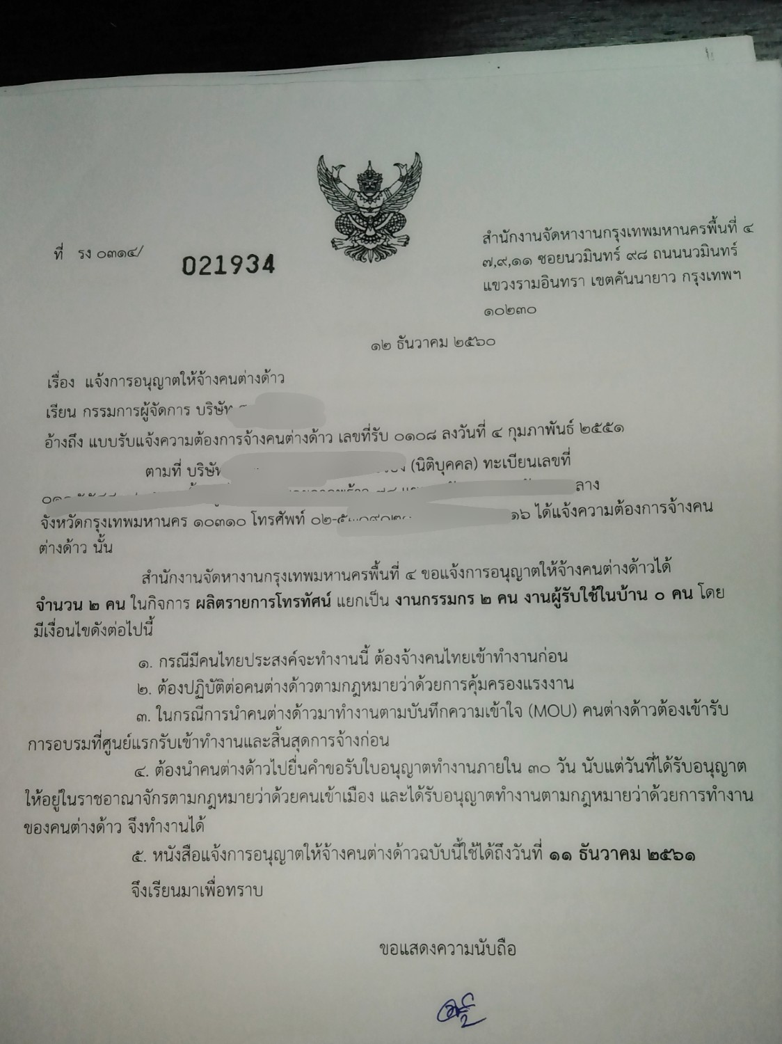แจ้งการอนุญาตให้จ้างคนต่างด้าวอยากทราบว่าใบนี้คือใบอะไรคะ