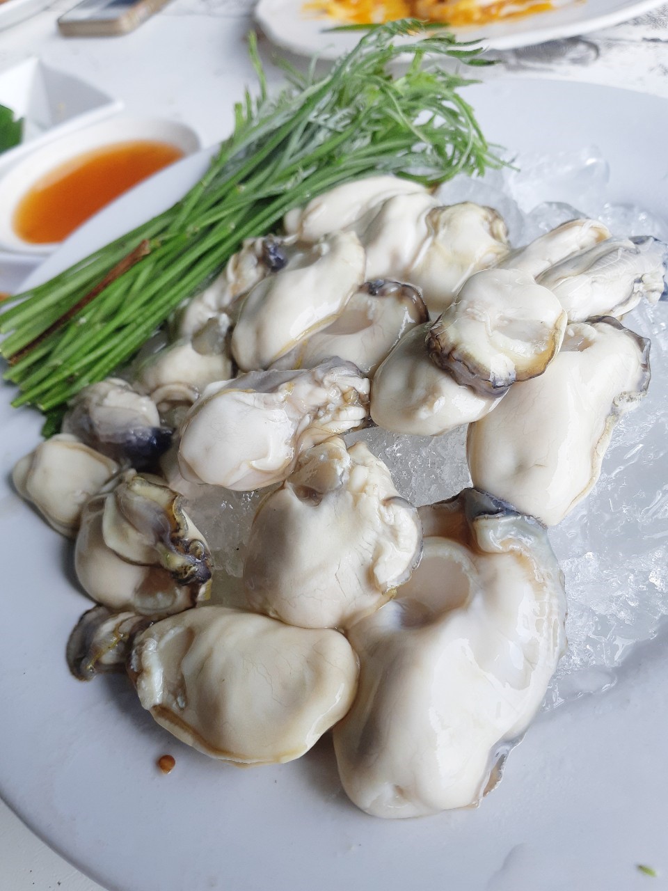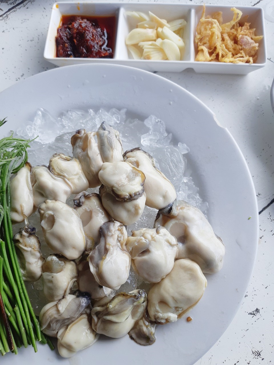 หอยนางรม - ที่ร้านจะมีขายแบบเป็นตัว ตัวละ 80 บาท กับเป็นชุด ชุดละ 150 บาท ไอเราก้อไม่ได้ถามว่าต่างกันยังงัย คิดว่าแบบเป็นชุดน่าจะคุ้มกว่า 555 ทาสการตลาดล้วนๆก้อเลยสั่งมาเป็นชุด หอยตัวไม่ใหญ่มากแต่ก้อสดดีนะ เครื่องต่างๆก้อครบ กินแล้วปึ๋งปั๋ง ( หรอออออ )