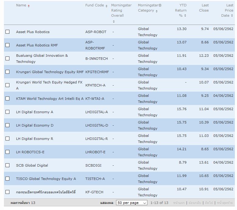 ลองค้นหาจากเว็บ Morningstarthailand แล้วใส่ช่องประเภทกองทุนว่า Global Technology ได้ผลมาประมาณนี้ครับ