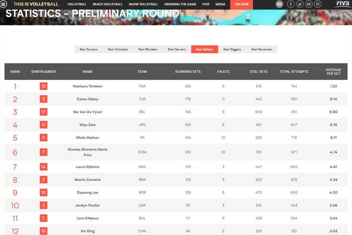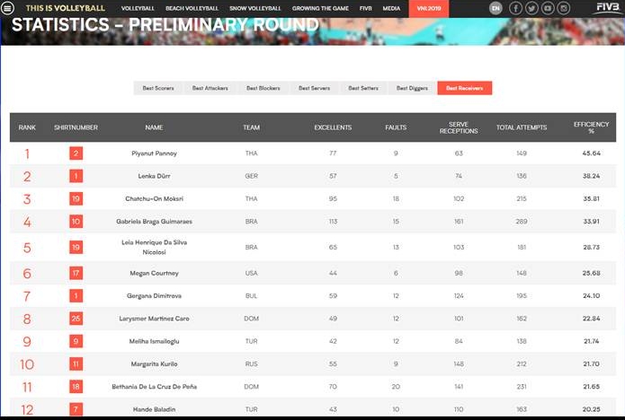 สถิติอย่างเป็นทางการ...ความสามารถในทักษะต่างๆ ของผู้เล่นสาวไทย เมื่อจบสัปดาห์แรก จาก เว็บ VNL 2018