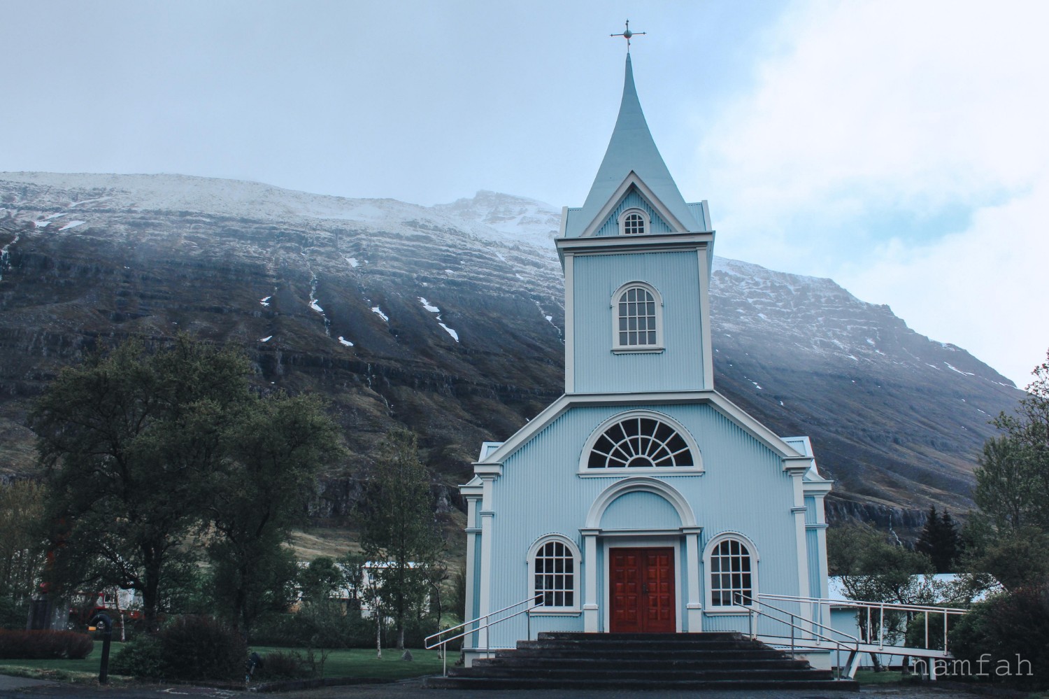 คือโบสถ์ Seyoisfjaroarkirkja โบสถ์ประจำเมืองสีฟ้าสดใสราวกับภาพวาด