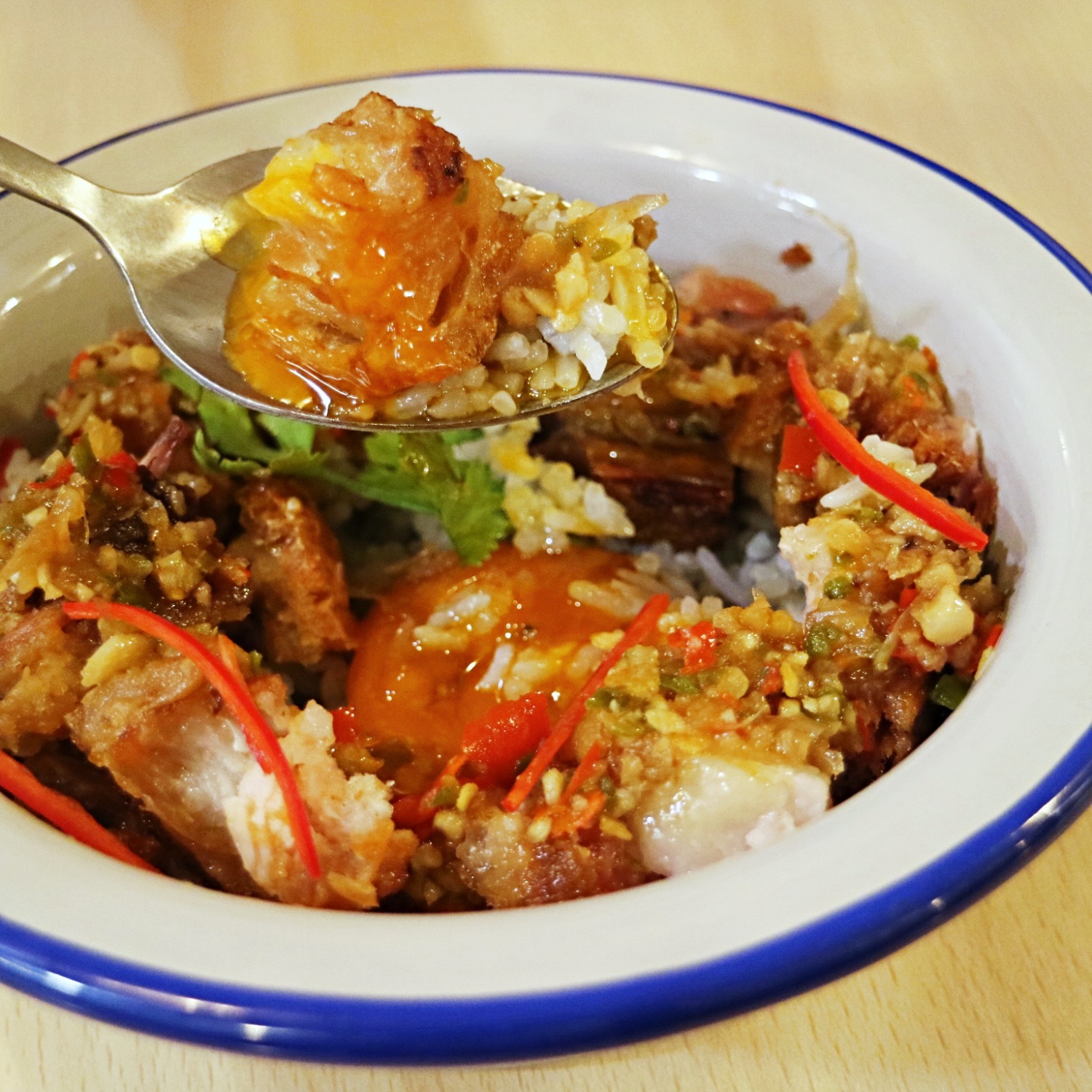 หมูทุกชิ้นกรอบทั่ว หนังหมูเคี้ยวมันไล่ระดับชั้นไปกับส่วนเนื้อที่ไม่เหนียว พริกกระเทียมเพิ่มรสชาติจัดจ้านฝังลิ้นน่าจดจำ แถมยังมีไข่แดงดองน้ำปลาวางจุ้มปุ๊กอยู่กลางชาม ซึ่งตัวน้ำปลาหอมหวานไม่เค็มโดด หกใส่เสื้อผมจนตอนนี้ยังไม่ได้ซักเลย หอมดี