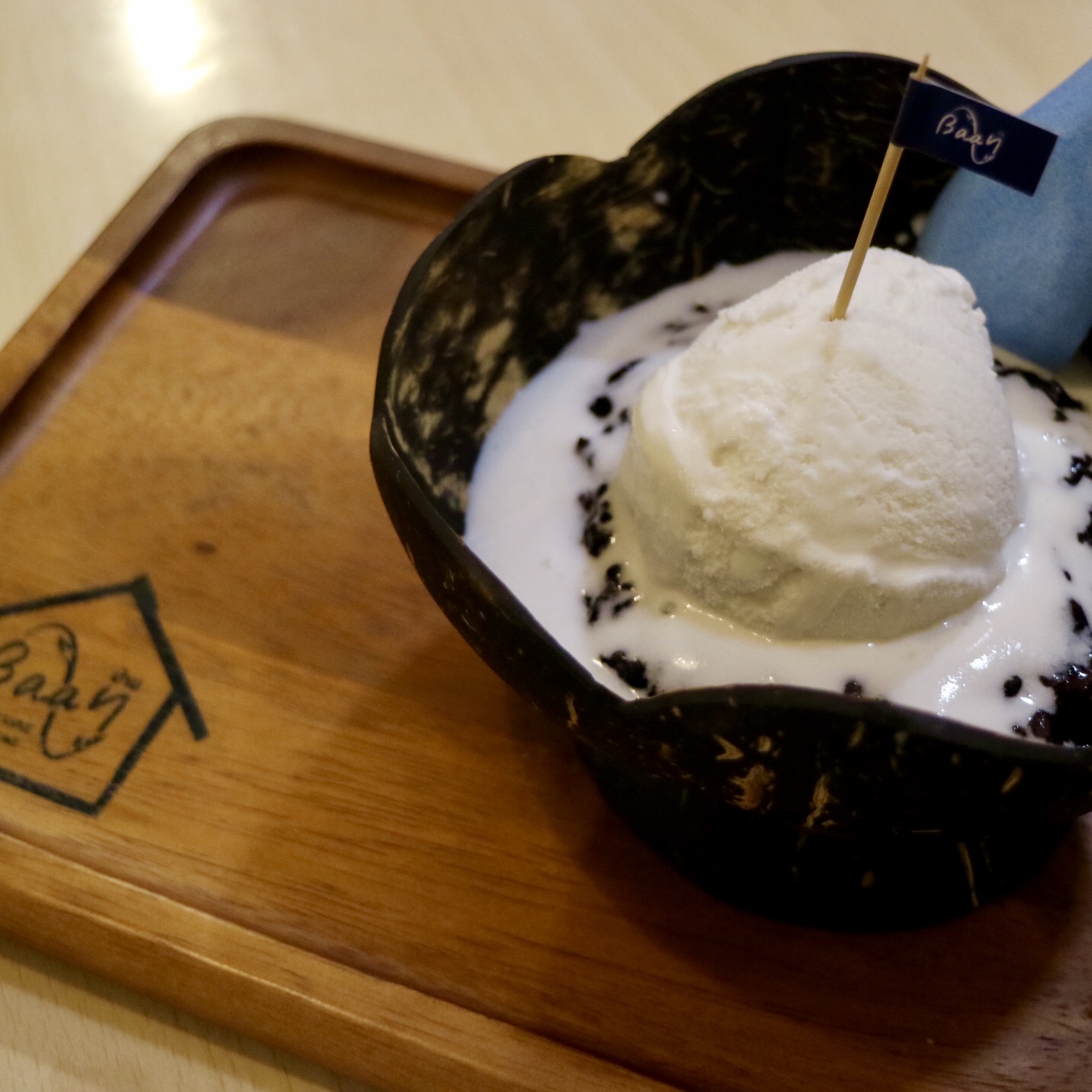 ปิดมื้อด้วย “ไอศกรีมกะทิกับข้าวเหนียวดำ” ข้าวเหนียวดำหนึบๆ โปะด้วยไอศกรีมโฮมเมดหวานละมุนช่วยล้างลิ้นจากหมูกรอบรสจัดเมื่อครู่ เนื้อไอศกรีมเนียนนุ่มและอ่อนโยนคล้ายนางฟ้าลงมาล้างบาปให้หมูกรอบ เพื่อไม่ให้หลงเหลือรสชาติอะไรติดค้างอยู่บนโลกใบนี้อีกแล้ว