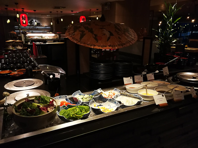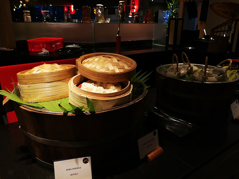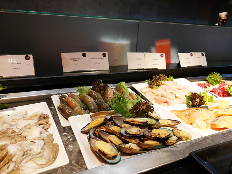 ต่อไปเป็นส่วนของ Teppan Yaki เราสามารถเลือกว่าต้องการเนื้อสัตว์อะไร หยิบใส่จาน และให้พนักงานนำไปปรุงบนกระทะ และตามมาเสิร์ฟเราที่โต๊ะครับ มีพวกอาหารทะเลให้เลือกทั้ง หมึก กุ้งแม่น้ำ หอยแมลงภู่ ปลาแซลมอน ไก่ หมู เนื้อวัว และผักต่าง ๆ