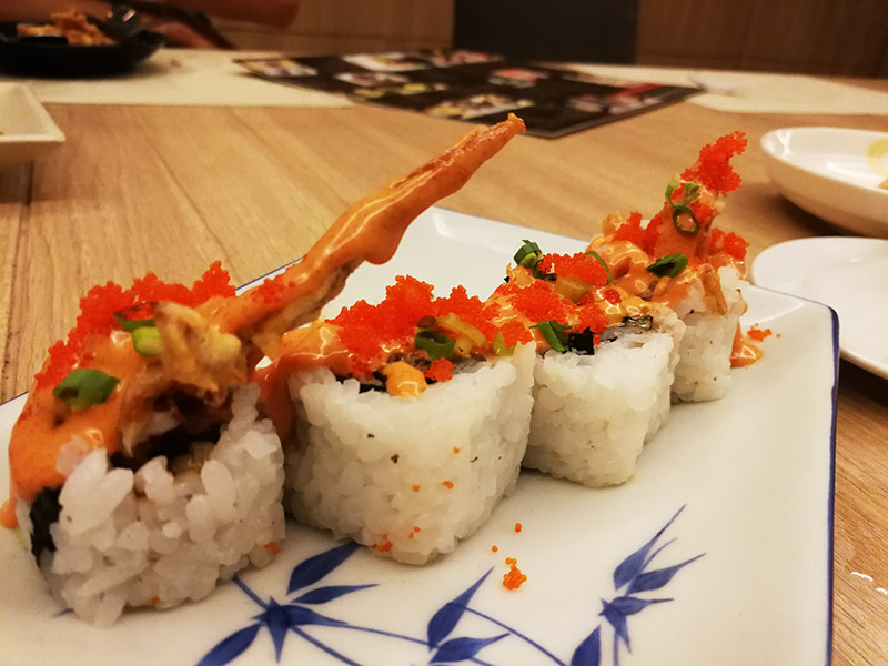 มาต่อกันที่จานนี้ครับ ซูชิโรลปูนิ่ม จานนี้แอดมินให้ดาวกับการจัดจานและสีสันของอาหารซึ่งหน้ากินมาก ๆ ครับ จานนี้เหมาะกับคนที่ชอบทานวาซาบิหรือเผ็ดนิด ๆ เนื่องจากตัวซอสจะเผ็ดจี๊ด ๆ เล็กน้อยคล้าย ๆ กับวาซาบิ ถ้าใครชอบทางนี้จานนี้ถือว่าใช้ได้เลยครับ แต่สำหรับผมแล้วขอปูนิ่มเทมปุระเพียว ๆ ดีกว่าครับ อิอิ