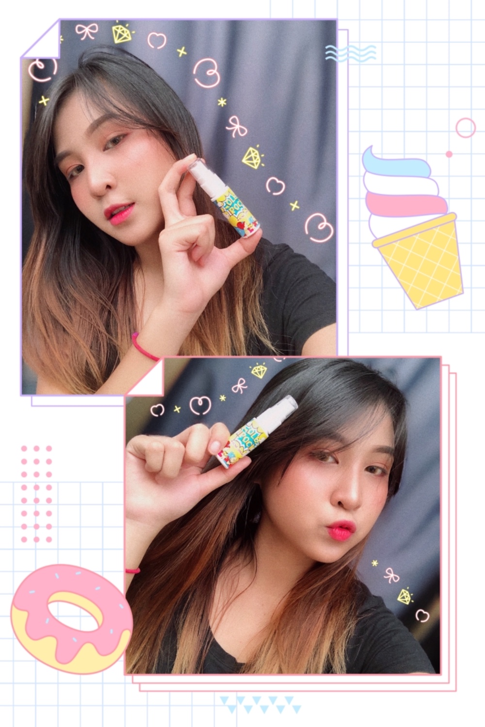 วิธีการใช้ ก็ใช้ไม่ยากเลยใช้หลังทำความสะอาดหน้า เช้า – เย็น หรือระหว่างวันเป็นประจำ และความเก๋คือหัวน้องเค้าเป็นสเปรย์ฉีดง่ายๆแค่ กดสองสามฟืดก็ทั่วหน้า แนะนำนะคะฉีดห่างจากหน้าสักหน่อยประมาณ 20 – 30 ซม. กำลังดีฉีดใกล้ไปมันจะไม่ฉ่ำทั่วหน้ามันจะเปียกเอา555555 ระหว่างฉีดหลับตากันด้วยนะคะเดี๋ยวเข้าตาเอาแล้วจะลำบากเอาน้า ละอองสเปรย์มีความเย็นๆและกลิ่นหอมโดนใจมาก ติดใจสุดก็คือกลิ่นหอมอ่อนๆให้ความรู้สึกลูกคุณหนูผู้ดีมากก เชื่อว่าทุกคนได้ลองจะต้องชอบเหมือนโบแน่ๆ