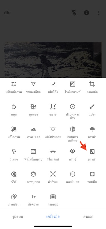 กดที่คำสั่ง "ขาวดำ" แล้วเลือกรูปแบบที่คุณชอบ สำหรับผมเลือกที่ "สว่าง" ครับ จะได้ภาพที่พื้นหลังเป็นสีขาวสว่าง